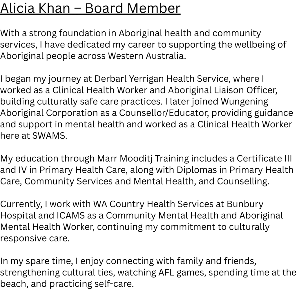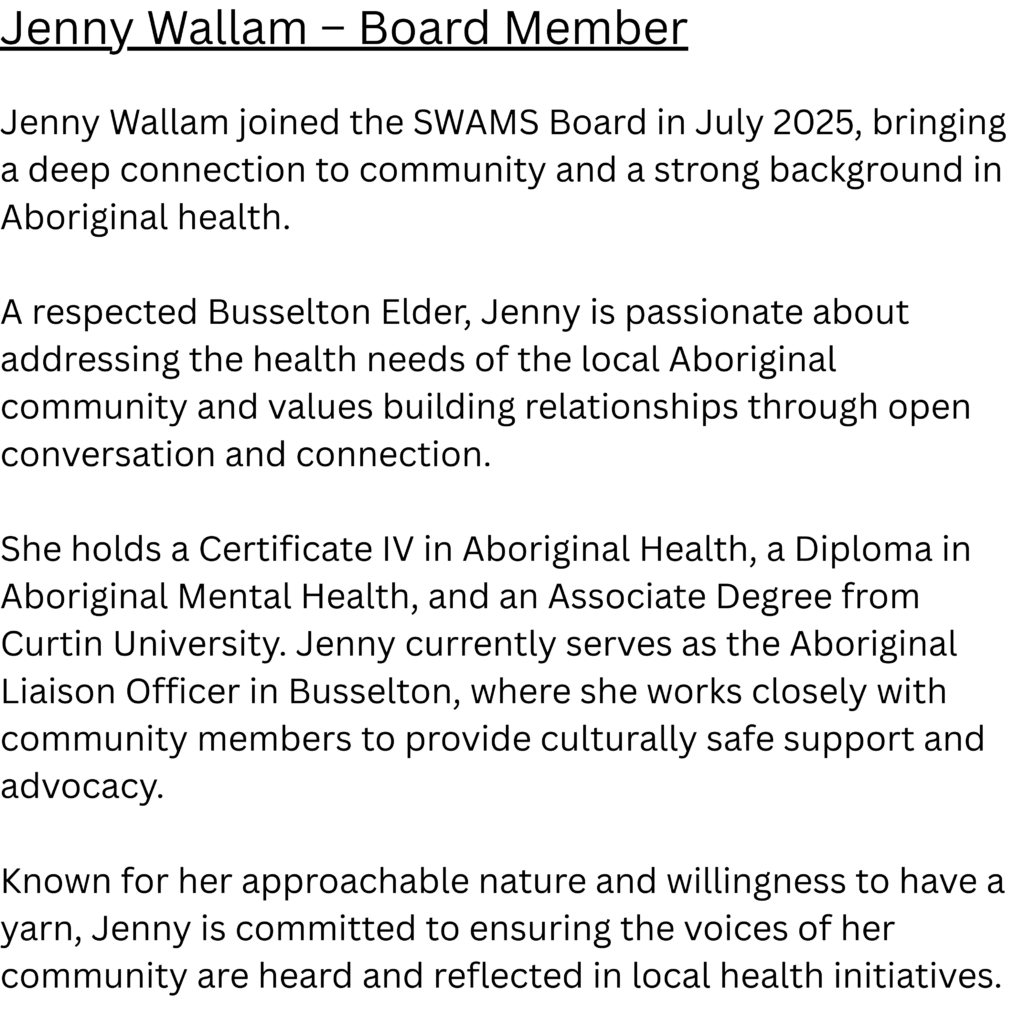 At SWAMS our vision is “Our Health, Our Way”. We are dedicated to ensuring that local Aboriginal and Torres Strait Islander community members participate and lead the decision making about the medical services being delivered to their community.