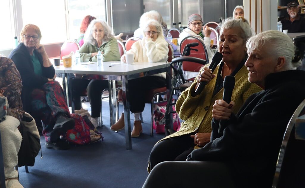 Maria Jenner and Pauline Rousell sang from their seats at the Aged Care program’s social outing in August.